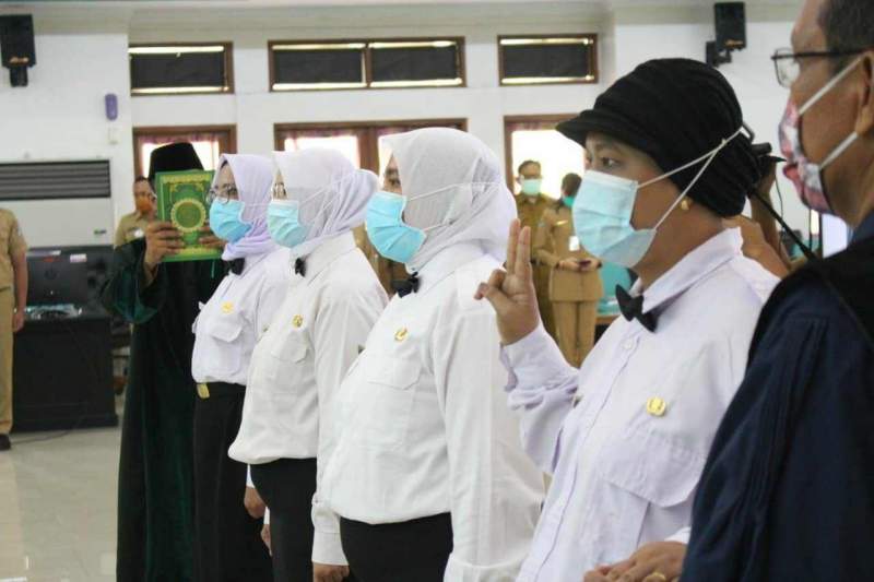 Prosesi pengambilan sumpah/janji dipimpin oleh Bupati Tangerang Ahmed Zaki Iskandar disaksikan Sekretaris Daerah Moch Maesyal Rasyied dan Kepala Badan Kepegawain dan Pengembangan SDM Kabupaten Tangerang Hendar Herawan.