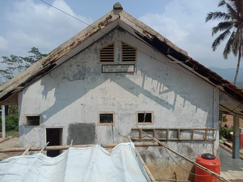 "Bahkan kami sudah menutup 1 ruang kelas 2 , karena sudah betul betul sangat membahayakan,demi keselamatan bersama, belajar di alihkan ke panggung tempat bermain anak," ungkap kepsek. (Cecep)