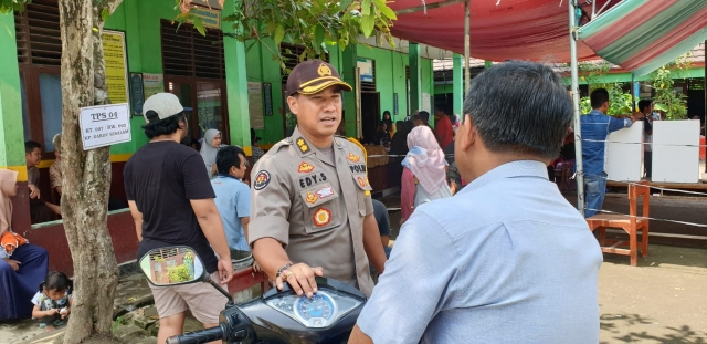 AKBP Edy Sumardi memantau di salah satu TPS dan menghampiri warga yang sedang mengantri, tidak lupa Edy mengucapkan salam dan memberikan edukasi dan bimbingan serta arahan kepada masyarakat tentang undang-undang nomor 09 tahun 2019 Tetang mikasnime pemungutan dan perhitungan suara di TPS.