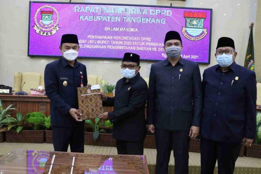 Hal tersebut ditandai dengan penyerahan Keputusan DPRD tentang Rekomendasi atas LKPJ Bupati Tangerang Tahun 2020 yang diserahkan oleh Ketua DPRD Kab Tangerang dan terima langsung oleh Wakil Bupati Tangerang H Mad Romli dalam Rapat Paripurna DPRD Kabupaten Tangerang, Senin (05/4/2021) siang.