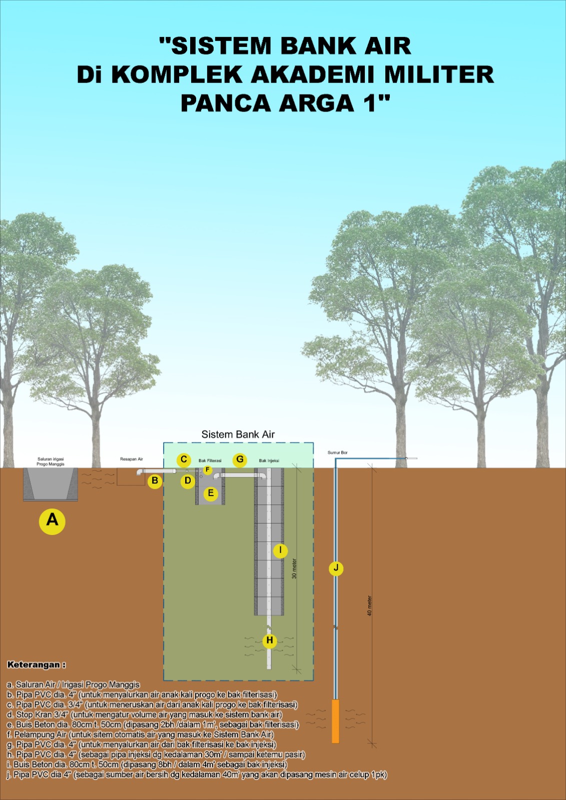 Hasil dari kajian tersebut adalah pembangunan saluran air ke dalam tanah dan pembuatan satu unit bank air di lingkungan Akademi Militer yang berada di Jalan Gatot Soebroto No.1 Desa Banyurojo Kecamatan Mertoyudan Kabupaten Magelang Jawa Tengah. Ini jelas menunjukkan komitmen Sudirman Indra untuk mengembangkan konsep bank air dan tol air di bawah sungai. (Lingga)