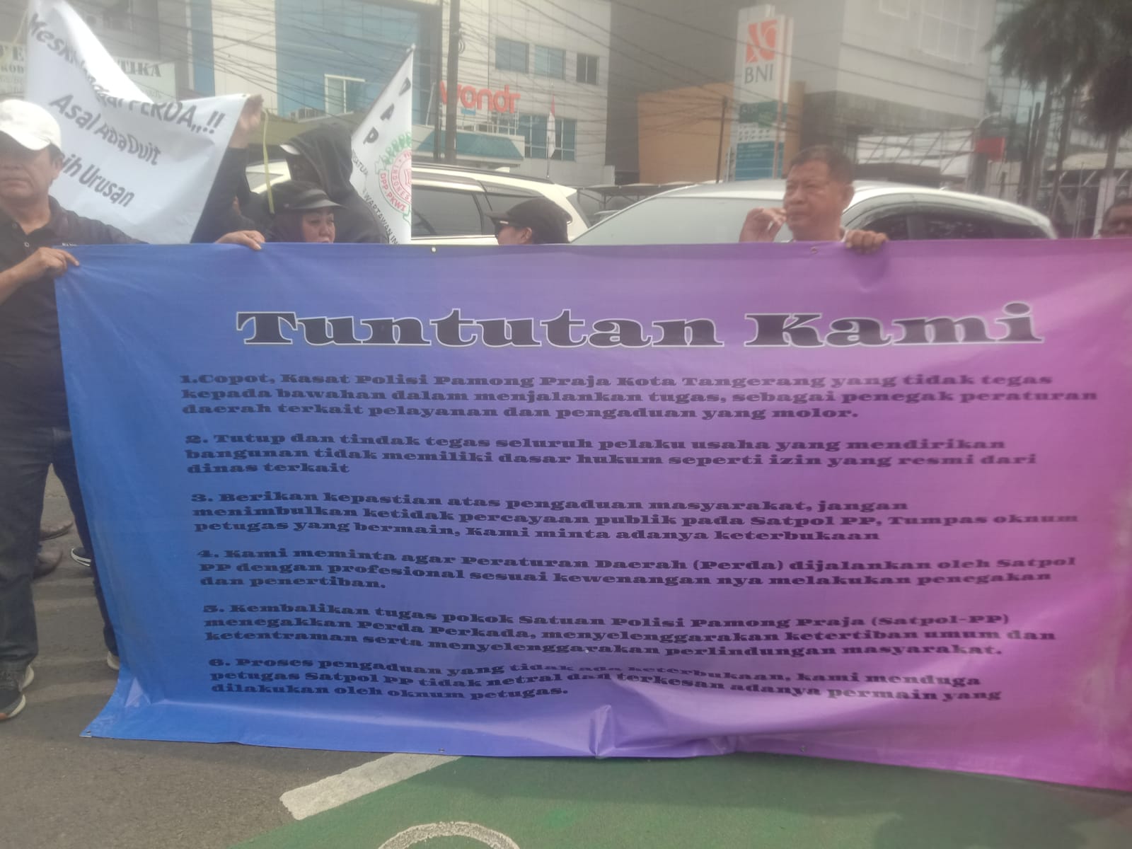 Sambil membentangkan poster dan spanduk dengan berbagai tulisan, para peserta aksi menyoroti kinerja Satpol PP Kota Tangerang, khususnya Bidang Penegakan Hukum Daerah (Gakumda), yang dianggap tidak transparan dalam memberikan informasi kepada awak media. Hal ini terkait dengan beberapa laporan mengenai bangunan yang berdiri tanpa izin.