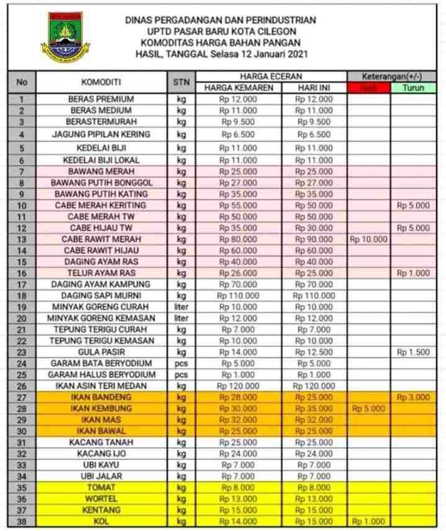 Sedangkan ada beberapa bahan pokok yang mengalami penurunan diantaranya cabai merah kriting dari Rp. 55 ribu menjadi Rp. 50 ribu perkilo gram, cabai hijau TW dari Rp. 35 ribu menjadi Rp. 30 ribu perkilo gram, telur ayam ras dari Rp. 26 ribu menjadi Rp. 25 ribu perkilo gram, gula pasir dari Rp. 14 ribu menjadi 12,5 ribu perkilo gram dan dan ikan bandeng dari Rp. 28 ribu menjadi Rp. 25 ribu perkilo gram.