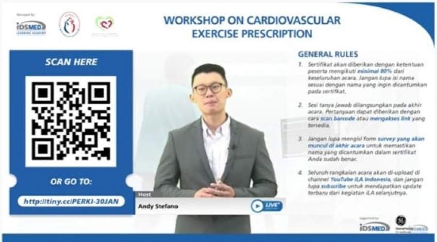Salah satu webinar merupakan hasil kerjasama antara PERKI (Perhimpunan Dokter Spesialis Kardiovaskular Indonesia) dengan iLA, mengangkat isu dalam dunia kesehatan dengan judul Workshop on Cardiovascular Exercise Prescription. Workshop yang menggunakan konsep webinar ini dihadiri oleh para pembicara yang kompeten dalam bidangnya yaitu dr. Cholid Tri Tjahjono, MKes, SpJP, dr. Irsad Andi Arso, Sp.PD, Sp.JP(K), M.Sc, dimoderatori oleh Dr. dr. Basuni Radi, SpJP K dan diikuti oleh berbagai tenaga kesehatan seperti dokter dan perawat.