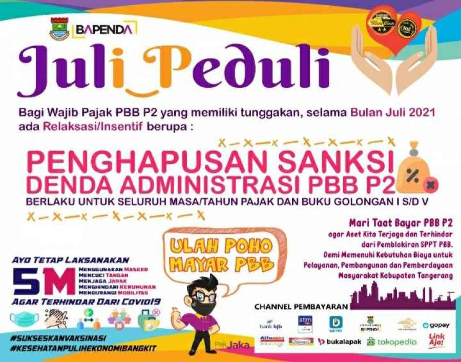 “Bagi Wajib Pajak PBB P2 yang memiliki tunggakan, selama bulan Juli 2021 ada relaksasi atau insentif penghapusan sanksi denda administrasi PBB P2 yang berlaku untuk seluruh masa pajak atau tahun pajak dan buku golongan I sampai dengan golongan V,” ujar Dwi Chandra Budiman, S.STP, M.Si selaku Kepala Bidang Pajak Daerah PBBP2 dan BPHTB Pada Badan Pendapatan Daerah.