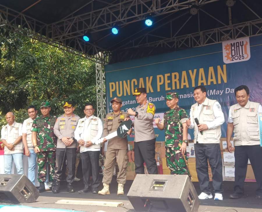 Tangerang, lensafokus.id - Momen unik terjadi saat Gubernur Banten Andra Soni mengangkat tubuh seorang anggota Satuan Polisi Pamong Praja (Satpol PP) Kabupaten Tangerang bernama Uwes K. Aksi itu terjadi saat puncak perayaan peringatan Hari Buruh Internasional di Puspemkab Tigaraksa, Kabupaten Tangerang, Banten, pada Kamis (01/05/2025).