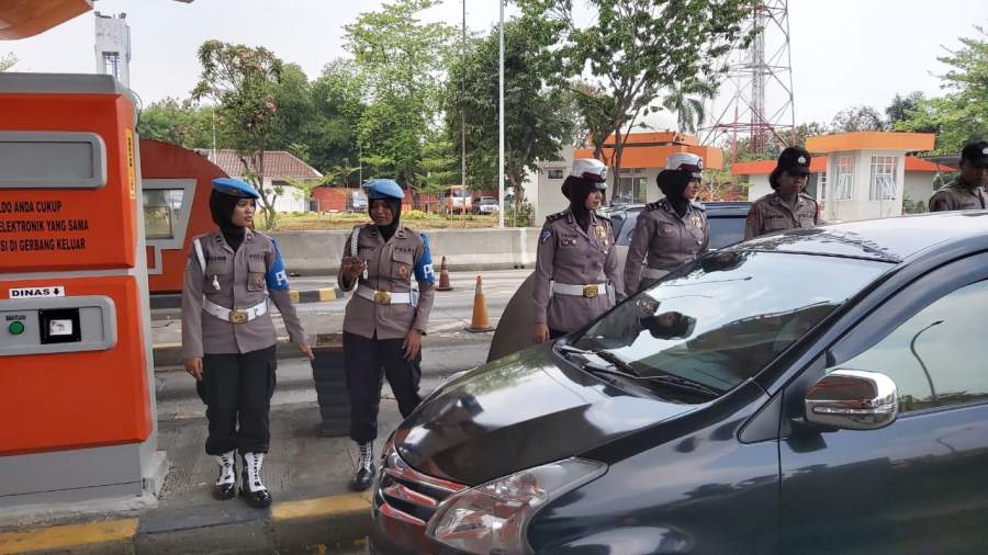 Di tengah terik mata hari, nampak Polisi Polisi Wanita (Polwan) cantik bak model dan berwajah manis berdiri di pintu tol ikut melakukan Penyekatan, mereka tampak semangat melakukan tugasnya.